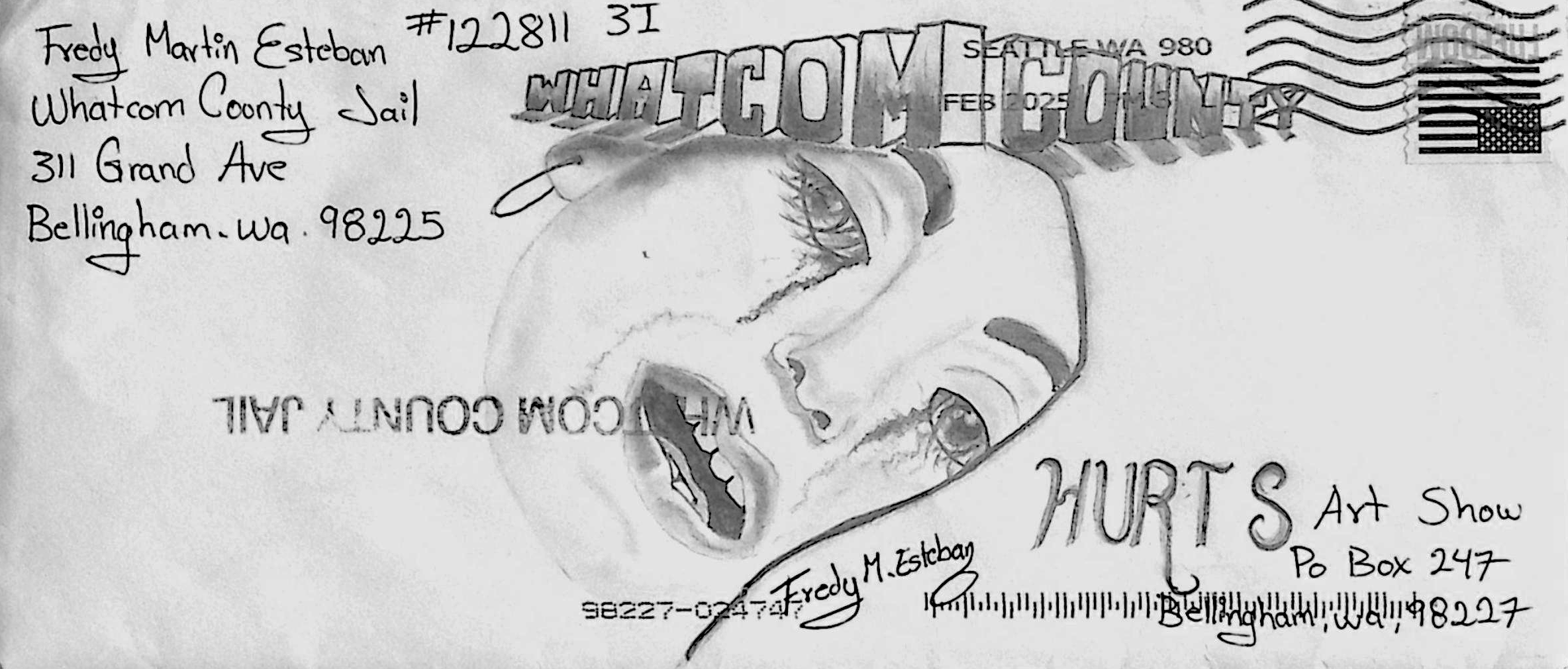 Previous Image Next Image “Whatcom County Hurts” by Fredy Martin Esteban $30 “Whatcom County Hurts” by Fredy Martin Esteban $30 Graphite on envelope 9.5×4″